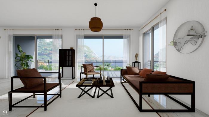 Diese 4-Zimmer-Wohnung befindet sich ebenfalls im Obergeschoss und verfügt über eine Wohnfläche von ca. 97 m². Sie überzeugt durch ein ruhiges, harmonisches Wohnambiente, viel Tageslicht sowie eine beeindruckende Aussicht auf die umliegende Landschaft. Der offen gestaltete Wohn- und Essbereich mit integrierter Küche ist großzügig und lichtdurchflutet. Von hier aus gelangt man direkt auf zwei Terrassen, die einen weiten Blick über den See und die umliegenden Berge eröffnen. Die Außenflächen laden zu entspannten Stunden im Freien ein und unterstreichen den besonderen Charakter dieser Wohnung.