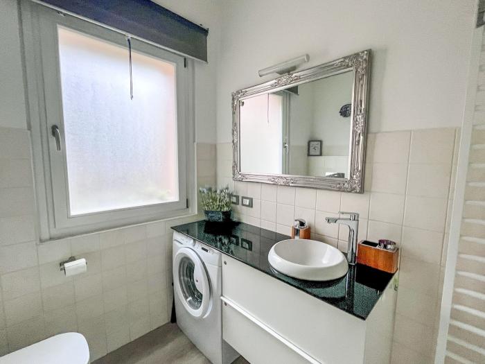 - Modernes Badezimmer mit Eckdusche, Bidet, Waschmaschine und Fenster