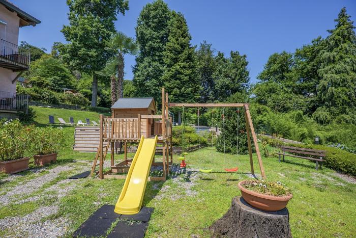 - Ca. 1.000 m² großer Gemeinschaftsgarten mit ca. 10 m x 7 m großem Pool, Sonnenterrasse, großer Liegewiese sowie Panoramasicht auf den See, die Borromäischen Inseln und die umliegenden Berge