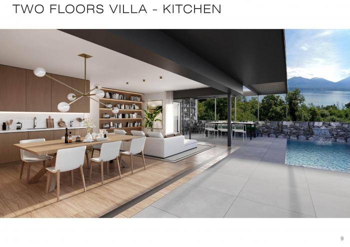 ■ Wohn-/ Esszimmer mit geschickt integrierter Küche, traumhafter Sicht auf den See und die gegenüber liegenden Berge und Ausgang auf die 52 m² große Terrasse und in den Wintergarten.